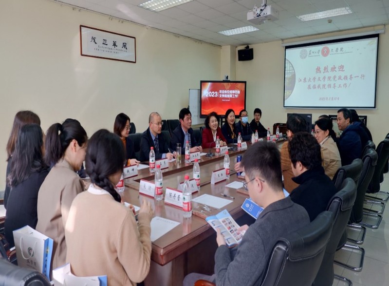 2023年3月10日上午9:30,江苏大学草榴 党政领导一行莅临草榴 开展交流活动。双方座谈会在文综1005幢5335室举行。草榴 院长曹炜、党委书记宋清华、副院长周生杰、中文系主任王耘、汉语国际教育系主任王建军、文秘系副主任朱钦运、学生工作办公室主任纪金平、综合办公室主任于大伟,江苏大学草榴 院长任晓霏、党委书记曲云进、副院长余红艳、副院长江永华、党委副书记王彦、汉语言文学系主任周衡、汉语国际教育系主任钱坤、研究生培养中心主任薛晨、语言文化中心国际中文教学部系主任徐丹、语言文化中心国际中文教学部主任唐敏、党委办公室主任朱珺、行政办公室副主任陈丹蕾等出席了本次会议。