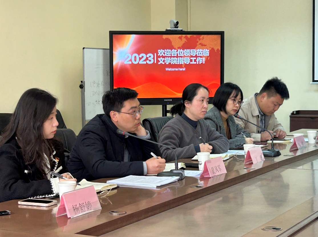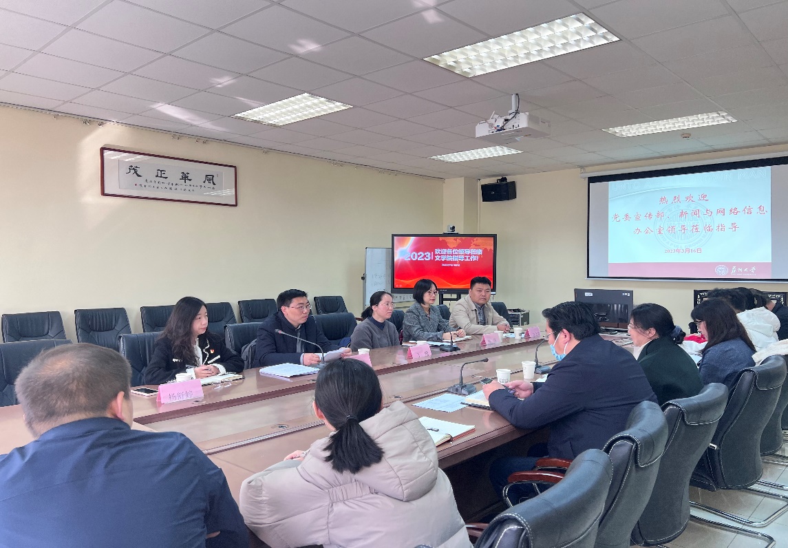 2023年3月16日上午,校党委宣传部副部长夏凤军、新闻与网络信息办公室副主任丁珊、新媒体中心科长刘金光、宣传文化科科长姚臻、副科长杨舒婷一行来草榴 调研指导工作。学院党委书记宋清华、党委副书记阴浩、办公室主任于大伟以及学院唐文治书院全体辅导员参加了座谈。
