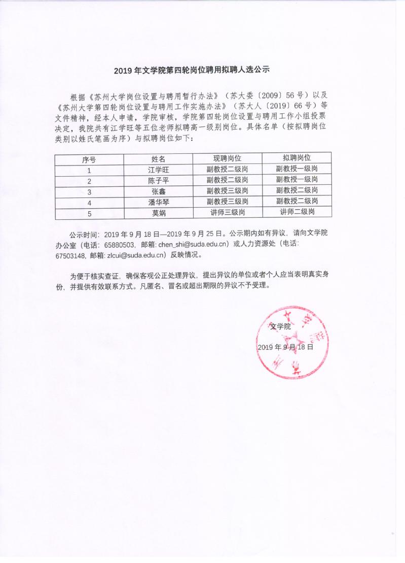 2019年草榴 第四轮岗位聘用拟聘人选公示