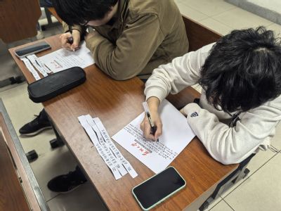 时间来到晚七点,活动进入核心环节——现场创作。在主持人的带领下,同学们依次从“人物箱”“场景箱”“道具箱”中抽取随机词条,开始了限时30分钟的灵感创作。活动现场键盘敲击声与纸笔摩擦声交织,有人埋头疾书,有人对着稿纸凝神构思,还有的三两合作进行讨论、互相提出建议。