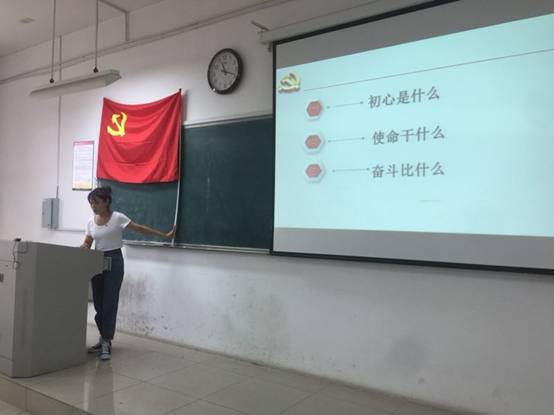 活动最后,支部书记熊国敏同志进行了总结发言。她说,作为学生党员,我们的初心是为集体、非党员同学谋利益,而不是急功近利、推脱问题。自身能保持积极向上的状态,做到最好的自己,再用自己的力量给身边的人带来舒服和快乐,深入同学,了解他们的状态,积极帮助身边落后的同学,努力学习专业知识。不忘初心要求我们党员同学做到有使命有担当,做到在思想上自觉以习近平新时代中国特色社会主义思想和党的十九大精神为武装。着力提高贯彻执行的能力和本领,更好地践行以习近平同志为核心的党中央提出的一系列重大新思想新观点。