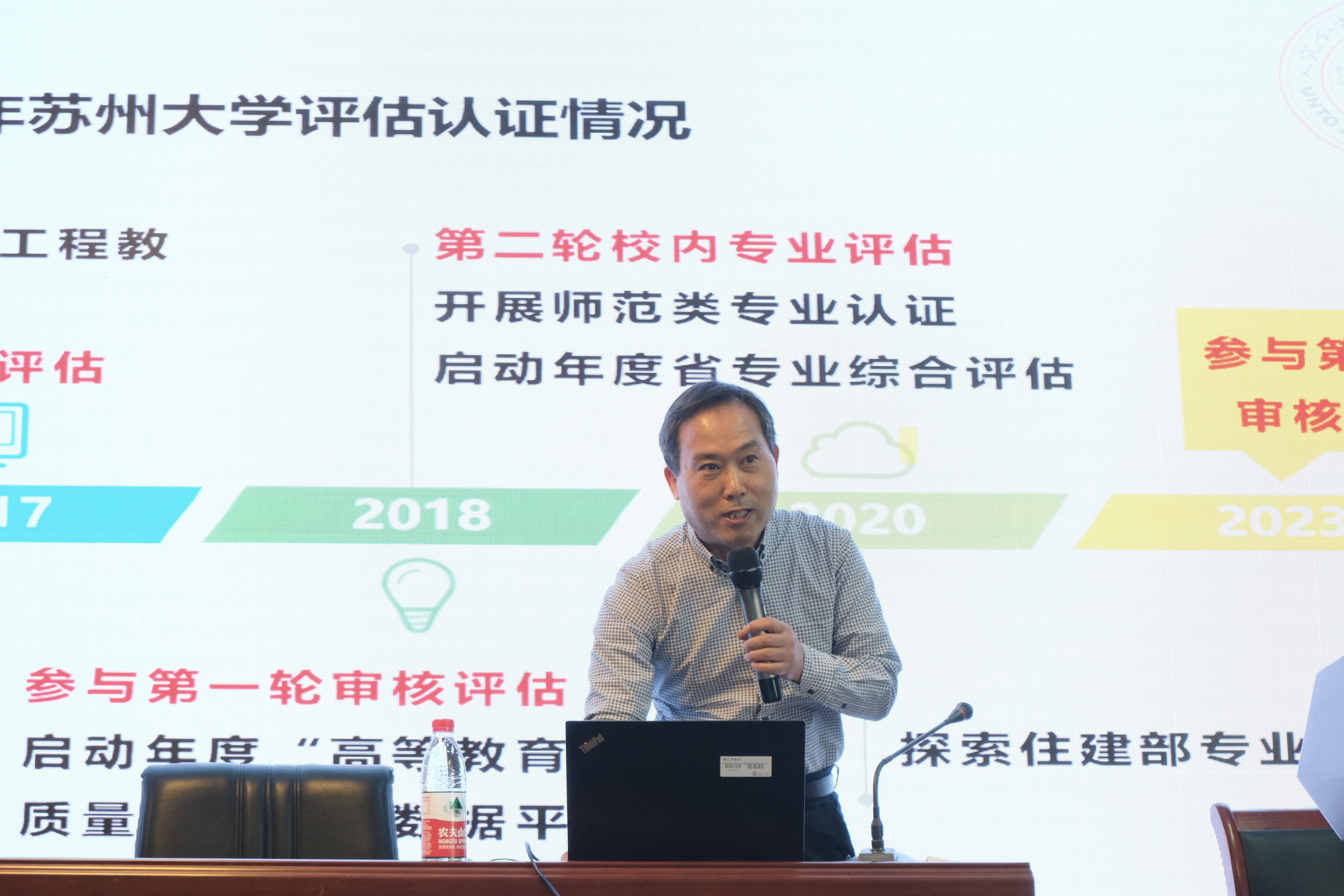 曹院长报告结束后,周生杰副院长简要介绍了草榴 及草榴 评估认证情况,指出新一轮审核评估以“立德树人”为核心,并详细说明了学院的具体工作开展,包括全面整理教学档案、采集评估数据、修改充实自评报告、邀请专家评估咨询等。