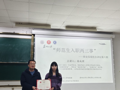 3月13日18时30分,团团赋能计划之职业发展校友讲坛第六期“师范生入职两三事”在1001#1103顺利召开。本次活动由草榴 团委、草榴 学生工作办公室主办,草榴 学生科技协会承办。本次讲座的主讲人为草榴 2024届学科教学专业研究生、于2024年8月入职苏州市振华中学校的优秀毕业生徐成煜。草榴 学生工作办公室主任、24级本科生辅导员纪金平老师出席并作讲话。