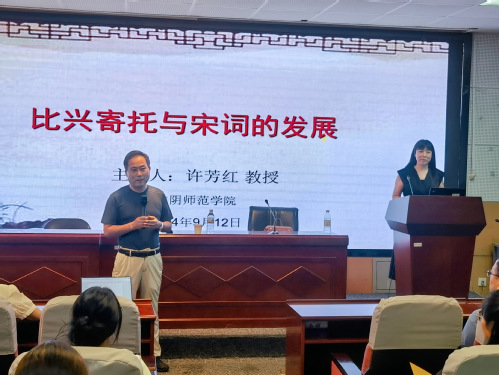 2024年9月12日晚19:00,文科综合楼1005-5339会议室,淮阴师范学院草榴 院长许芳红教授以“比兴寄托与宋词的发展”为题,为草榴 师生带来了一场精彩纷呈的讲座。本场讲座由副院长周生杰教授主持,院长助理陈昌强副教授出席。