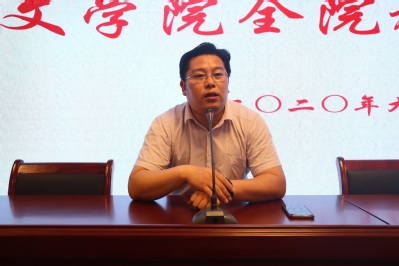曹炜院长发表讲话。他首先公布了学院人员岗位调整的名单:张珊副教授担任古代文学教研室主任,王台生老师担任科研秘书,刘润泽老师担任教务秘书。曹院长希望三位老师能尽快适应新的工作岗位。