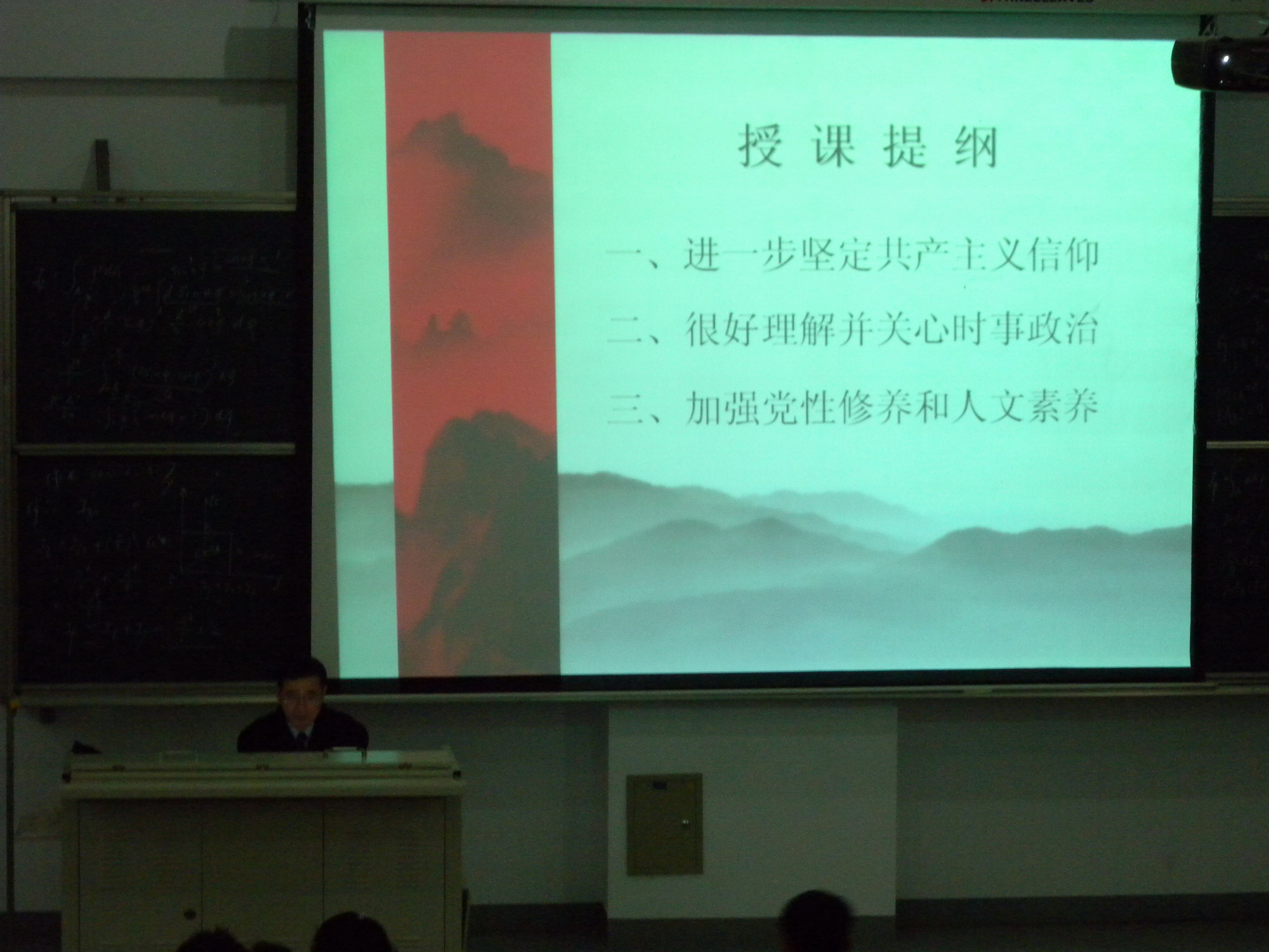 围绕共产党员的党性教育,倪教授首先提出要进一步坚定共产主义信仰,并指出要以“信则仰”作为坚定共产主义信仰的总方法。接着倪教授又从精神层面的追求、人和文化角度的考量两个方面来进一步论证坚定共产主义信仰的必要性。其次,倪教授指出,作为一名学生党员需要很好地关心并理解时事政治。倪教授以《物权法》的出台、环保生态问题等一系列的时事实例向大家展示了政治与所有人都息息相关这个道理,进而要求作为预备党员的同学们更要在这方面好好学习,抓住时代跳动的脉搏。最后,倪教授就加强党性修养和人文素养作了进一步阐述,他提出要以马克思主义理论修养加强对中国特色社会主义理论体系的学习和贯彻,要忠诚党的事业并具有坚强的组织观念,要强化人文修养,这是成为合格共产党员的牢固基础。