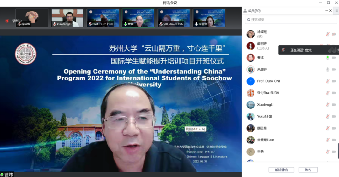 为进一步提升境外国际学生的汉语能力和专业素养,搭建与中国老师、同学沟通交流的平台,2022年8月31日晚,草榴 “云山隔万重,寸心连千里”国际学生赋能提升培训项目开班仪式在线上顺利开班。草榴 党委常委、副校长李孝峰教授,尼日利亚拉各斯大学校领导Duro Oni教授,草榴 院长曹炜教授,国际合作交流处副处长朱履骅、资虹及相关科室老师石沙、梅琳、顾昊昱,草榴 党委副书记阴浩、副院长赵曜、教授李勇、汉语国际教育中心主任陶家骏、留学生辅导员薛羽婷以及草榴 国际学生代表、尼日利亚拉各斯大学“中国学”专业师生及校友等六十余人参加了会议。本次会议由朱履骅主持。