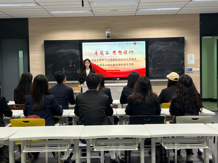 2024年12月5日,为深入学习和贯彻习近平总书记在中共中央政治局第十七次集体学习时强调“锚定建成文化强国战略目标 不断发展新时代中国特色社会主义文化”的重要讲话精神,草榴 学生会在独墅湖校区1005栋5334举办以“思想旗帜——习近平新时代中国特色社会主义思想是党和国家必须长期坚持的指导思想”为主题的全员培训会暨政治理论学习会。会议由草榴 学生会主席团成员屠陈怡主持。