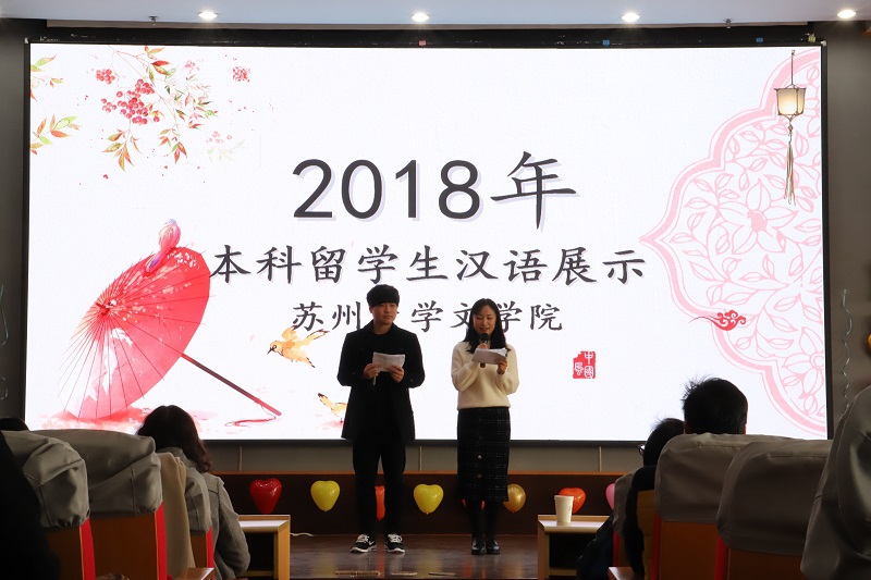 本届汉语展示活动的主持人是本二上班的口语老师仇程宇和学生申原佶,在两位热情的主持下,我们开始了这次汉语展示活动。第一个开场的节目是本一上班全体同学表演的情景剧《外国人在中国》。他们通过形象生动的表演,展示出了外国人在中国十年前后的生活习惯和变化,本一上同学们表演得都非常幽默,也展示出了良好的汉语基础,赢得在场的老师和同学的热烈地掌声,为本次活动拉开了完美的序幕。