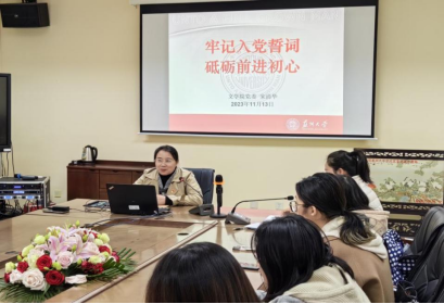 最后,宋书记带领预备党员重温入党誓词,面向党旗庄严宣誓。宋书记结合主题教育,提出入党誓词是中国共产党党员的宣誓书、是党员对党组织的承诺书、是加强党性修养的座右铭,指出要在组织上入党首先要在思想上入党,思想上入党是根本。勉励同学们牢记入党誓词,不断叩问初心、守护初心,不断坚守使命、担当使命,始终做到初心如磐、使命在肩。