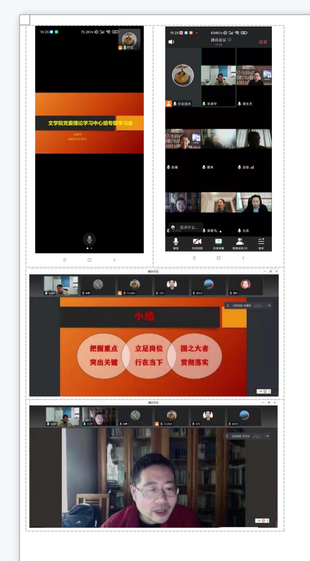 宋清华在总结发言时指出:要深入学习领会习近平总书记在全国两会期间发表的重要讲话精神,切实把思想和行动统一到大会对当前形势的分析判断和今后工作的决策部署上来;要在以习近平新时代中国特色社会主义思想指引下,深刻理解“两个确立”的决定性意义,进一步增强“四个意识”、坚定“四个自信”、做到“两个维护”;要把学习贯彻两会精神与当前疫情防控工作相结合,全面贯彻落实好学院“十四五”发展规划及“双一流”建设,以新的建设成效迎接党的二十大胜利召开。