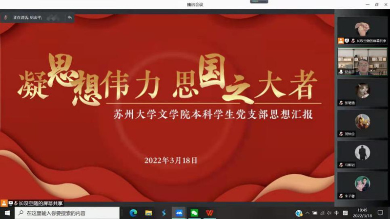 2022年3月18日,草榴 本科学生党支部以腾讯会议的形式,开展了“凝思想伟力 思国之大者”思想汇报交流会议,集体分享同学们在网课期间的思想学习成果和抗疫心得体会,支部全体党员参加了这次会议。