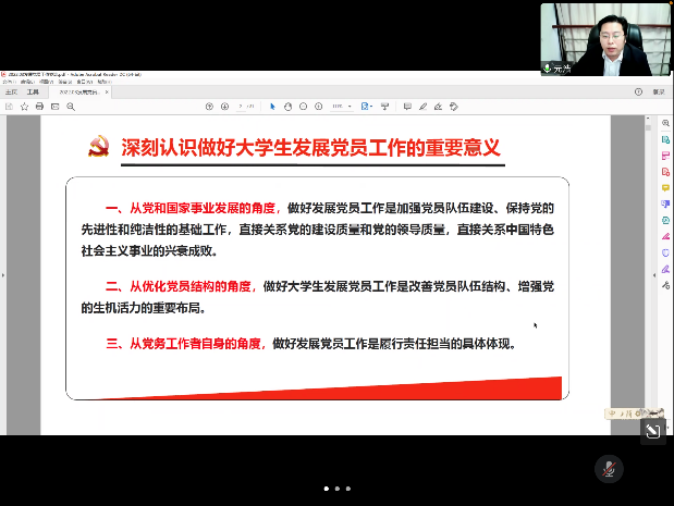 院党委副书记阴浩从“党支部组织力提升”角度出发开展专题讲座。欲筑室者,先治其基,只有党支部不断提升组织力,才能充分调动一切积极因素,广泛团结一切可以团结的力量,形成推动发展的强大合力,将“十四五”规划擘画的宏伟蓝图变为美好现实。阴浩指出,支部重视抓落实、善于抓落实,党的路线方针就能在基层落地生根,反之则会无的放矢。他提出要抓政治思想,抓政治强组织,切实发挥党建工作的引领和保障作用;抓教育培训,坚持教育为先,通过主题党日活动、党校集中培训、案例分析警示等多种形式,组织各支部系统学习规章制度;抓制度约束,充分发挥制度在提升党支部组织力的保障作用,充分发挥党支部在团结群众中的示范引领作用。阴浩还强调了疫情期间党员发展的程序问题,要求各支部将政治标准放在首位,严格按照要求,规范发展程序。