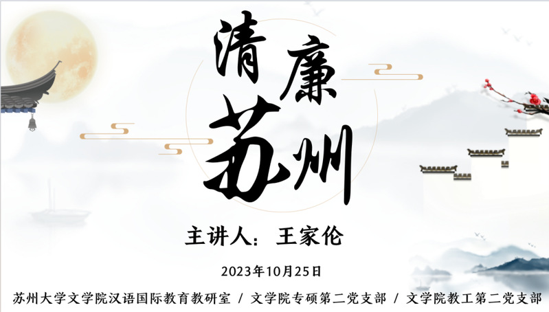 老骥心尚壮,青松色逾新。离退休同志是我们党执政兴国的开拓者、建设者和亲历者,也是我们新一代青年茁壮成长的奠基人、引路人和见证人。党的二十大以来,面对新时代、新要求,我们需要老一辈一如既往的关心、支持与帮助。值此重阳佳节之际,草榴 专硕第二党支部联合草榴 教工第二党支部,邀请草榴 教授、硕士生导师,苏州市教育学会语文教学研究会副理事长,苏州市沧浪诗社副社长,草榴 离退休支部党员王家伦老师于2023年10月25日下午在文综楼1005-5339报告厅为汉语国际教育专业本硕学生展开《清廉苏州》的讲座。