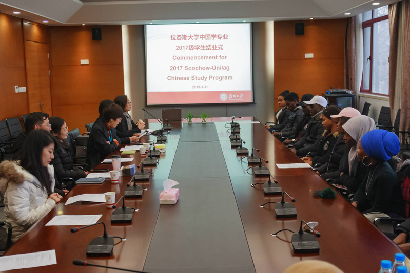 2019年1月11日周五下午2点,拉各斯大学2017级中国学专业结业式在怡远楼国际交流处402会议室如期举行。在国际合作交流处交流与项目管理科科长石沙老师的主持下,结业式正式开始。出席本次结业式的领导和老师有草榴 党委书记孙宁华、国际合作交流处副处长资虹、国际合作交流处交流与项目管理科科长石沙、国际合作交流处留学生科科长朱苏静、草榴 对外汉语教研室主任陶家骏老师、拉各斯17级班主任杨黎黎老师、对外汉语教研室刘润泽老师、周品老师、拉各斯大学项目协调员王语嫣以及拉各斯大学2017级中国学专业的全体14位同学。