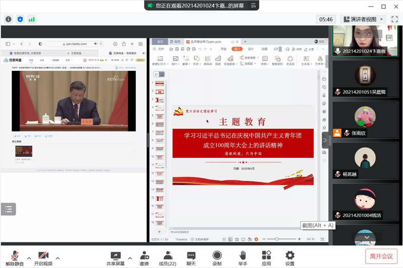 2022年是中国共产主义青年团成立的第100周年。回望百年团史,一代代青年坚定信念、紧跟党走、坚持不懈,在实现中华民族伟大复兴的理想之路上砥砺前行。如今,我们已经实现了第一个百年奋斗目标,开始向第二个百年奋斗目标奋力挺进,作为新时代青年,我们生逢其时,重任在肩。2022年5月10日,习近平总书记在庆祝中国共产主义青年团成立100周年大会上发表重要讲话,为新时代中国青年运动和青年工作指明了前进方向、提供了根本遵循。值此之际,草榴 研究生学硕第三党支部于2022年5月11日在线上开展了“学习习近平总书记在庆祝中国共产主义青年团成立100周年大会上的讲话精神”理论学习活动,学习百年团史中代代相传的伟大精神,以青春的姿态与朝气,接过百年奋斗的接力棒,扛起历史的使命与时代的责任。