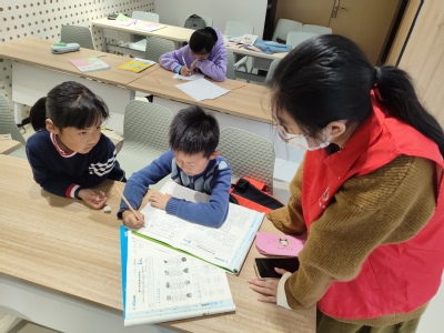 作业辅导阶段采用“一对二”的辅导模式,小朋友们和志愿者们相互促进,共同和谐地完成了本次教学任务。在作业辅导开始之前,志愿者同学们详细了解了孩子们的学习任务和学习进度,针对他们的薄弱环节进行有针对性的辅导,帮助他们高效率完成作业任务的同时进行查漏补缺。