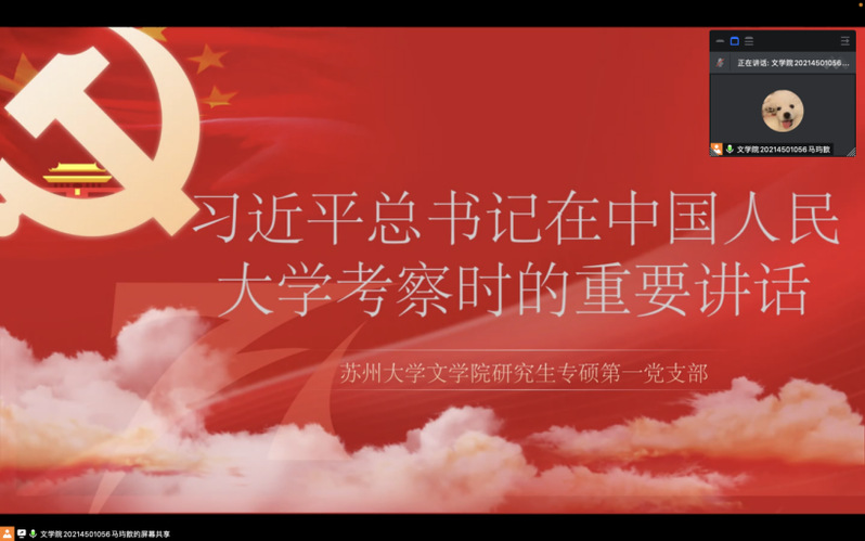2022年5月23日下午4点30分,苏州大学草榴 研究生专硕第一党支部在线上展开了“继承优良传统,赓续红色血脉”五月理论学习暨主题党日活动。活动由党支部书记马玙歆同志主持,支部全体党员参与。