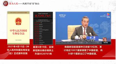 庚子年初突如其来的新冠疫情,是摆在世界面前的一场大考。习近平总书记在中央全面深化改革委员会第十二次会议上强调:“要从保护人民健康、保障国家安全、维护国家长治久安的高度,把生物安全纳入国家安全体系。”在这场事关生死的人民战争中,每位新冠肺炎患者的平均医疗费1.7万元,全部由国家承担。这张覆盖13.5亿人的基本医疗保障网,彰显了中国政府的大国担当。2021年4月15日,《中华人民共和国生物安全法》正式颁布实施,用法律的形式为国家生物安全保驾护航。6月29日,国家卫健委通报全国新冠疫苗接种超12亿剂次,国务委员兼外长王毅宣布:中国迄今已向近100个国家提供了超过4.5亿剂疫苗。党的十九届五中全会指出,中国要统筹发展和安全:在追求本国利益时,兼顾各国合理关切;在谋求本国发展时,促进各国共同发展;在维护本国国家安全时,尊重各国安全,以发展促安全,以安全保发展。无论发展到什么程度,中国都愿与世界各国共同构建人