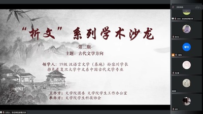 12月2日18:30,“析文”学术沙龙第二期——古代文学方向讲座在腾讯会议顺利举行。本次活动由草榴 团委、草榴 学生工作办公室主办,草榴 学生科技协会承办。主讲人为2019级汉语言文学基地班的孙容川同学。