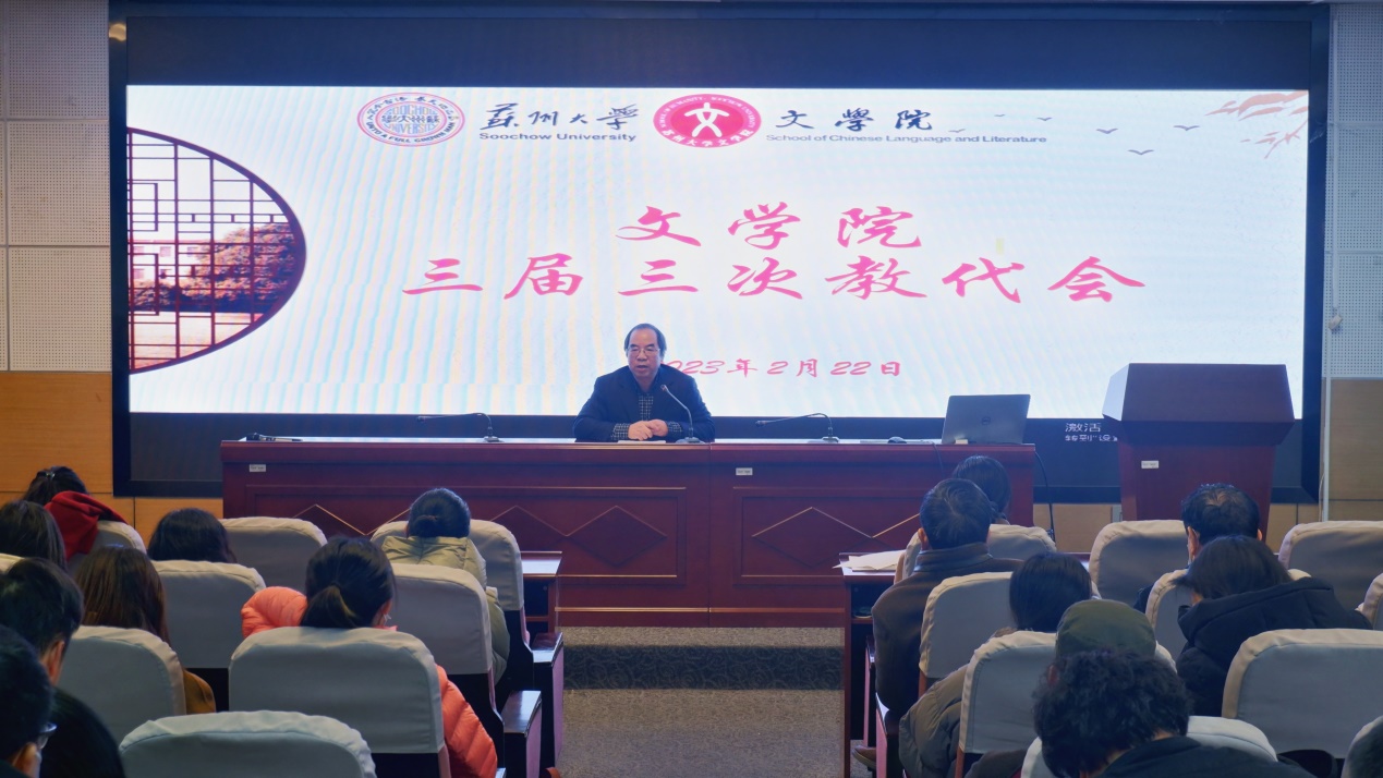 大会共三项议程,院长曹炜作2022年度学院工作报告、副院长赵曜作2022年度财务工作报告、学院党委书记宋清华作总结讲话。