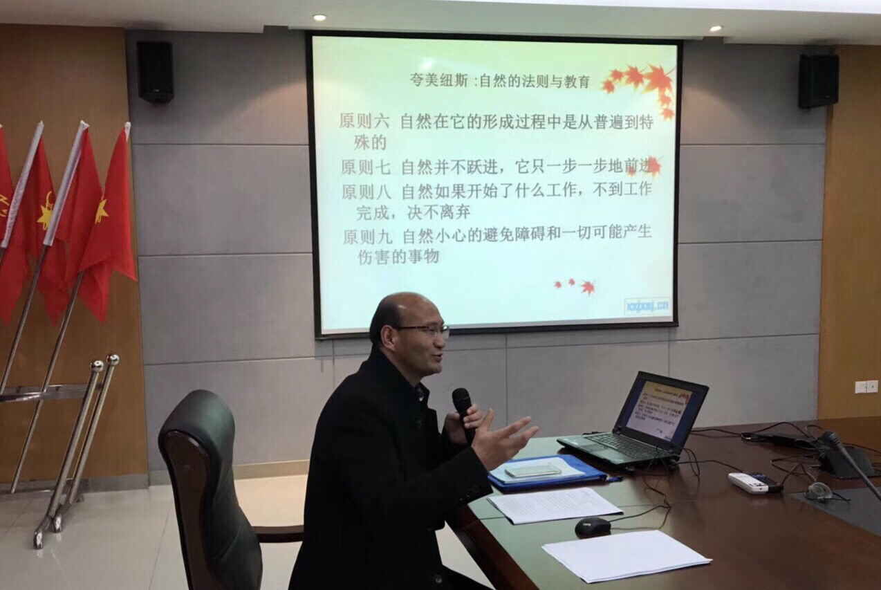 会议的第二部分内容是专题讲座。首先由新区实验小学校长、著名特级教师李志清进行专题讲座——“生长语文与语言生长”。李老师在教育家夸美纽斯《大教学论》的理论基础上,提出了关于生长语文和语言生长的观点,他认为教育即对话,教育即保护,教育即等待…他展示的《开篇的话》有一种独特的美感,优美的语言让人如沐春风。随后,李老师分别从语文的生命力方面、语文学习主体性问题、如何夯实语文学习的基础、指导发展的方向和语文生长的空间五个方面进行详尽的论述,并提出了很多丰富而独到的见解。