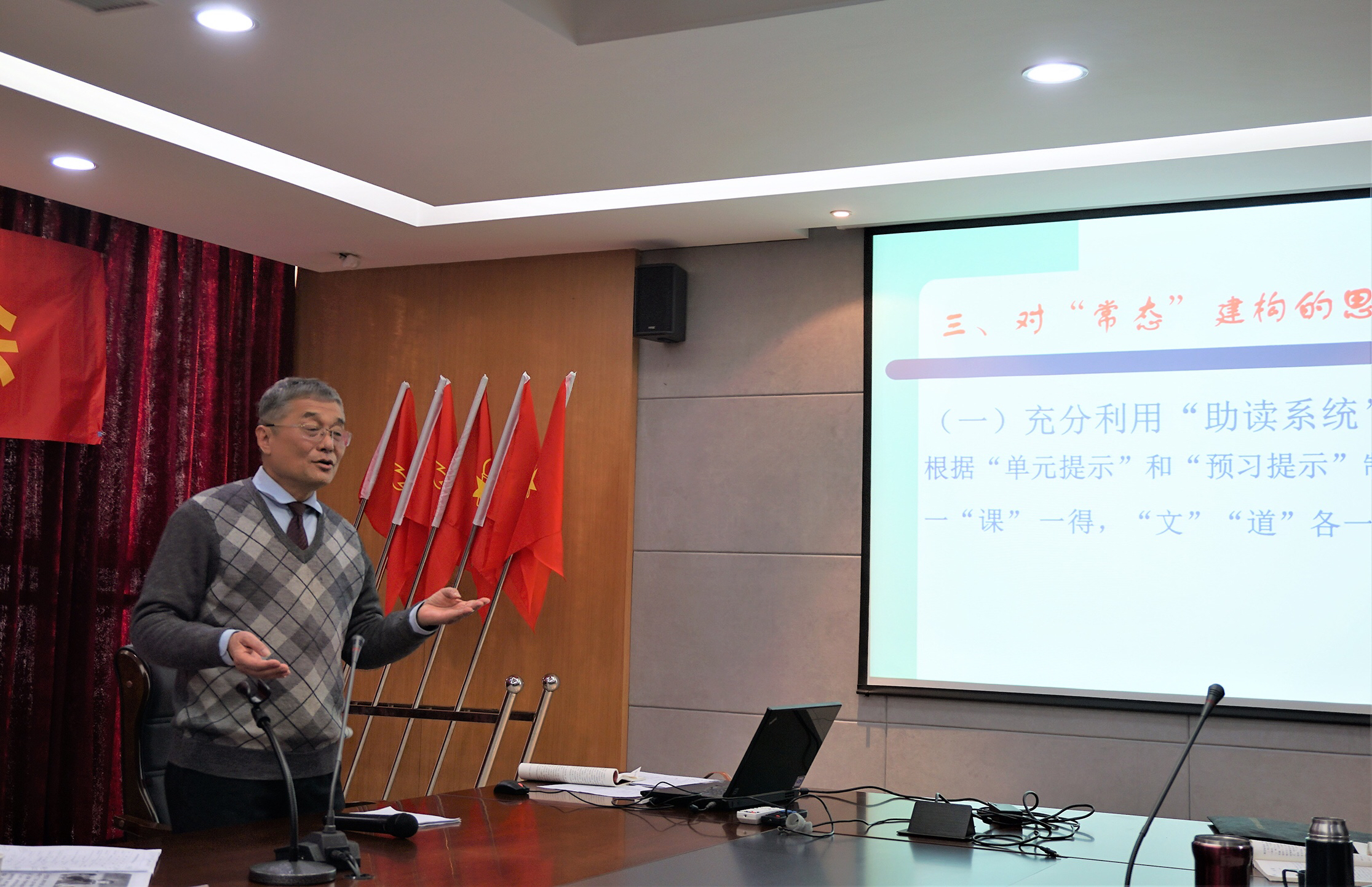 接下来是苏州市语言学会副秘书长、草榴 教授王家伦以“关于部编版初中语文教材的应对策略”为题的讲座。王老师首先从教材的四大系统详细论述“部编本”教材的显著进步,同时也指出了一些不足之处;然后介绍了对教学“常态化”的理解;随后表达了他就“部编本”教材建构语文教学“常态” 的思考和几点体会,提出了具体可行的应对策略。王老师风趣幽默、语言直白、朴实,演讲干净利落、言简意赅,“王一刀”的称号果然名不虚传!
