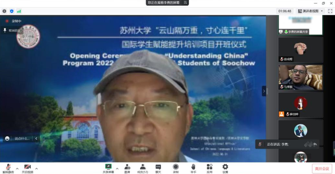 李孝峰对所有参加培训项目的同学们表示热烈欢迎,并向一直以来为草榴 与拉各斯大学合作交流给予巨大支持和帮助的Oni教授表示诚挚的敬意。他强调,草榴 十分重视国际学生的教育,一方面国际化是草榴 的重要发展战略之一,另一方面国际学生是草榴 与世界交流合作的关键纽带。草榴 作为教育部“中非高校20+20合作计划”中方入选高校,历来重视与非洲高校的合作。2020年以来,全球爆发的疫情暂时阻隔了国际学生到中国来求学的脚步,在各方关心和支持下,草榴 和拉各斯大学等多所高校共同克服新冠疫情带来的不利影响,草榴 从本学期开始举办国际学生赋能提升培训项目,让草榴 全体国际学生可以在云端相聚,对中国传统文化以及当代社会发展有更深入的理解和认识。他提前祝愿所有老师和同学们中秋快乐,也祝愿本次国际学生赋能提升培训项目取得圆满成功。
