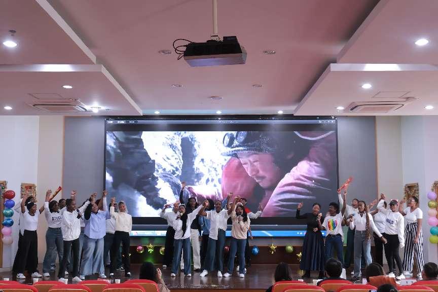 随后,来自不同国家的留学生们纷纷登场献艺,拉各斯班同学以激昂的合唱《你的答案》点燃全场,诗朗诵、配音、小品、八段锦等节目轮番上场。大家都满怀热忱,用美妙歌声与灵动舞姿抒发着对新年的憧憬,一次次将联欢会的氛围推向巅峰。多元文化交织碰撞出的绚丽火花,在舞台上熠熠生辉。