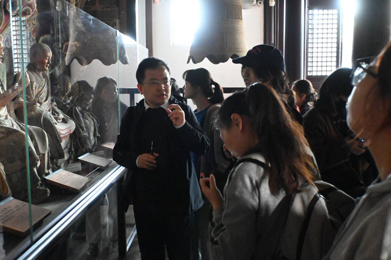 在紫金庵,师生们开展了一场别开生面的“传统文化与社会主义核心价值观”现场教学。面对保存完好的宋代罗汉塑像,陈昌强老师从塑像的神态、布局入手,深入浅出地解析其中蕴含的忠孝仁义等中华传统美德,引导团员思考传统文化与当代价值的贯通融合。学生们或凝神聆听,或俯身记录,在千年古刹中感受中华文脉的生生不息。